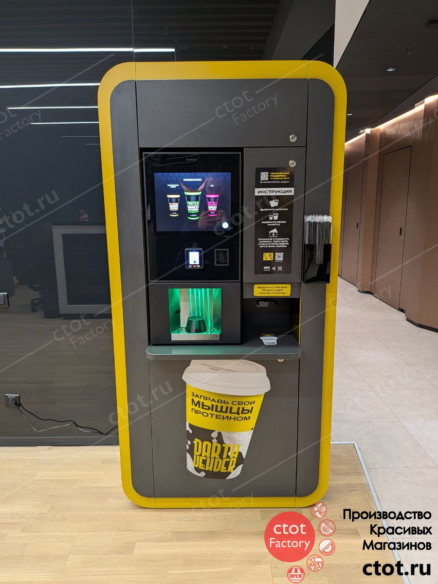 Мы рады представить новый микромаркет самообслуживания для протеиновых коктейлей Darth Vender, который уже успешно функционирует в центральном офисе Т-Банка! Спроектированный и произведенный фабрикой Ctot Factory, микромаркет стал идеальным решением для тех, кто ценит качество, удобство и стильный дизайн в рабочей обстановке. Микромаркет полностью автоматизирован, что делает процесс приготовления коктейлей супер быстрым и комфортным - никаких очередей и сложностей! Модуль имеет дверки, дающие полный доступ ко всем частям автомата, также имеет боковые отсеки с распашными дверцами для хранения расходных материалов. Все замки выполнены в системе "Одинаковые ключи" для удобства эксплуатации. Дизайн микромаркета, конечно же, был создан, чтобы идеально вписаться в пространство офиса Т-Банка: декоры цвета Чёрный графит и Жёлтый карри создают контраст и добавляют динамики и свежести помимо того, что отражают корпоративные цвета банка. Фабрика Ctot Factory не только создаёт качественную продукц