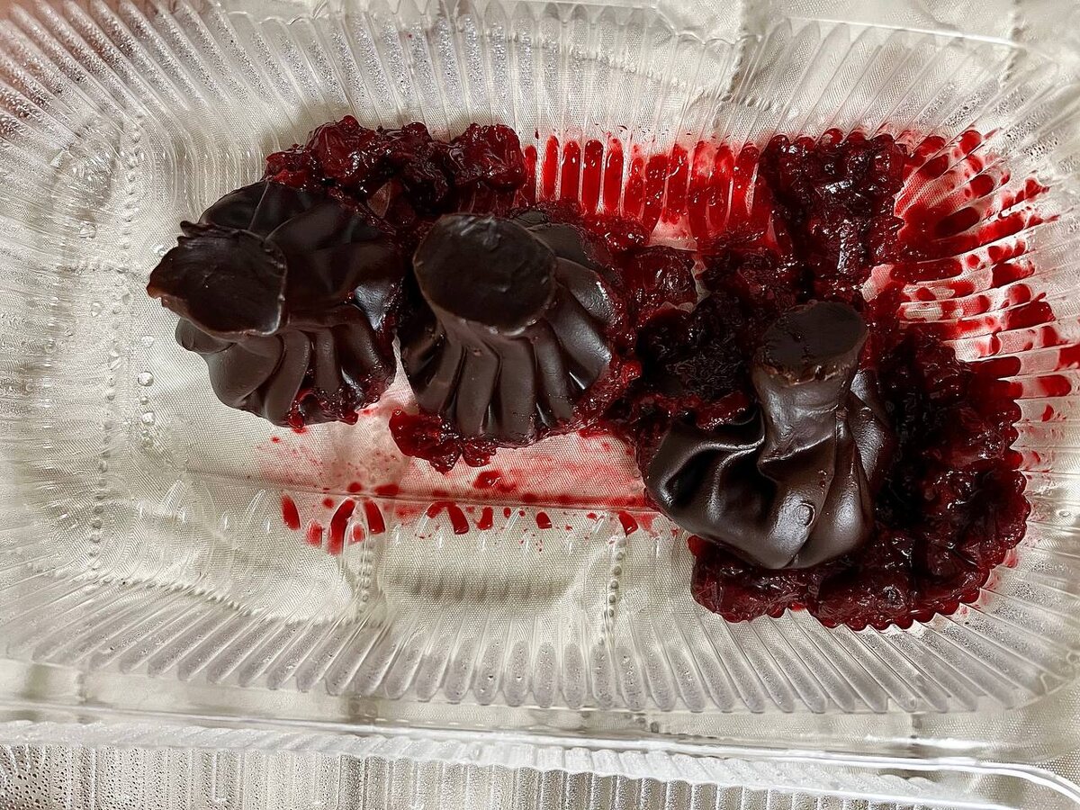 Приветствую на канале! Грузинская кухня меня не отпускает, поэтому очередной обзор. На этот раз достаточно известный в Москве ресторан "Ткемали", которых в столице 3 штуки. У нас с Дашей планировались домашние посиделки и я увидела, что у Ткемали действует скидка на еду навынос 20%, плюс в сезонных новинках появились шоколадные хинкали, а я такое просто обожаю! Поэтому решено было заехать за едой в Ткемали на Пушечной улице за едой, а в Магнит за соком и дополнением к соку ))) Начнем с десерта, потому что ради него все и затевалось ))) Три хинкали в контейнере в не очень подобающем для подачи виде - всюду размазанная вишня, да и вообще выглядят так себе. Шоколадное тесто как-будто из горького шоколада, при чем не самого лучшего, с явным привкусом какао. Тесто толстое и шоколадные вкус неочевидный. Начинка состоит из вишни, также вишня предлагается в качестве "соуса" - хинкали прямо вымазаны ей. Сама вишня, к слову, понравилась - как будто немного "пьяная" на вкус, я такую люблю. Сладки