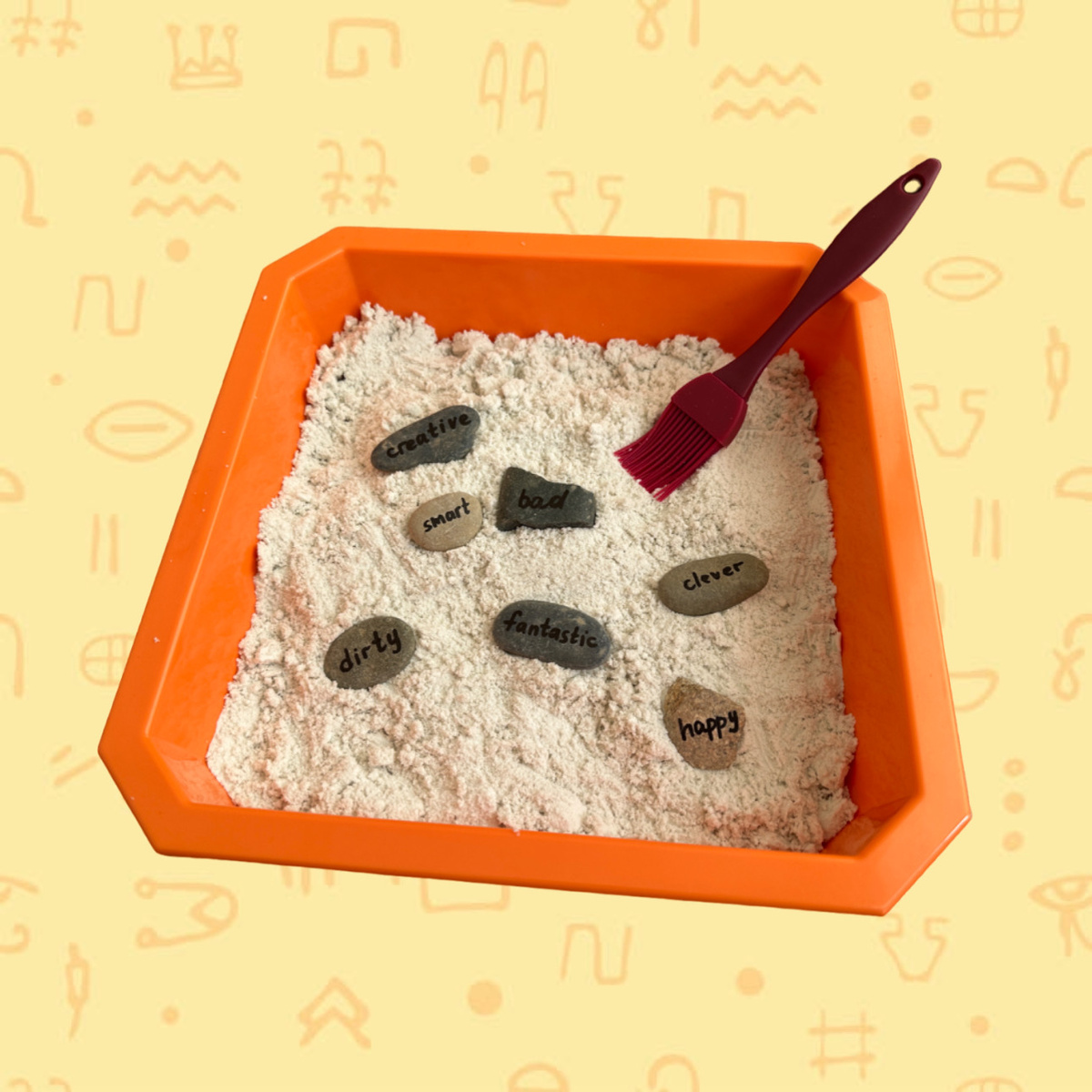 Хотите услышать историю о том, как мне пришла идея игры в раскопки?🙃 Я приехала в гости к родителям, зашла в детскую моей сестры и увидела у нее эту песочницу и 2 ведерка с кинетическим песком. Спросила, нужно ли это ей в ее 23 года, она сказала нет, и я забрала себе, не зная тогда, для чего мне это собственно нужно) Спустя некоторое время я решила насобирать камешков на нашем местном озере и написать на них глаголы, существительные и прилагательные. Планировала просто использовать их на уроках с детьми, например, тянуть камешек из мешочка и называть 3 формы глагола или писать множественное число существительного. И вот недавно сижу я в кабинете, взгляд падает на полку с камешками, потом на песочницу и у меня в голове загорается лампочка!💡Будут раскопки! В качестве "инструмента" можно использовать вот такую самую обычную кухонную кисточку. Только представьте восторг учеников, когда вместо простого составления степеней сравнения прилагательных по распечатке, они ощутят себя археолога
