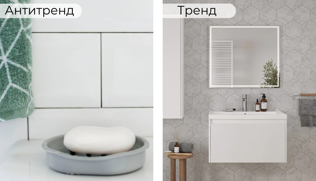 Мир дизайна динамично развивается. Появляются новые тренды, и что-то уходит на задний план. Модные веяния — явление переменчивое. Сегодня в тренде минимализм и функциональность, а вчера были популярны совсем другие интерьеры. Современная ванная комната — это то место, где мы начинаем и заканчиваем свой день. Поэтому оформлению уделяется особенное внимание. И, конечно, хочется, чтобы обстановка радовала красотой и удобством. Мы собрали топ устаревших деталей, которые, по мнению дизайнеров, потеряли свою актуальность и могут сделать вашу ванную несовременной. Стены из прошлого. Вечный вопрос: мат или глянец решен. Сейчас в тренде матовая плитка, а белая или яркая глянцевая утратила свою актуальность. Удешевляет и делает интерьер более «холодным». Сюда же можно отнести мелкую плитку с бордюрами, пеструю мозайку и панно с навязчивыми рисунками. Что вместо этого? Натуральный камень, матовые поверхности и крупная плитка на пике популярности. А сочетание разных фактур делают интерьер стильным