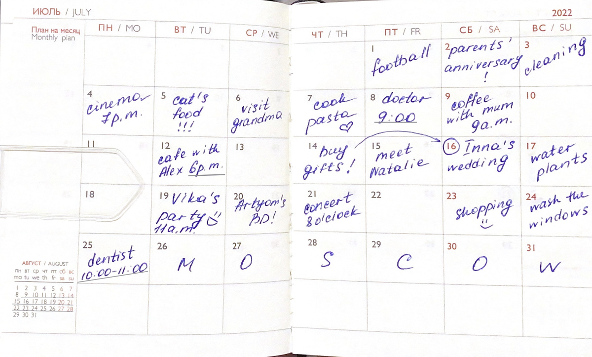 А точнее, всего один разворот. Как-то раз в Москве я купила ежедневник, который мне потом не понадобился, а я стараюсь не хранить дома ненужные вещи, поэтому я призадумалась, как же я могу хоть что-то полезное из него извлечь🤔 И придумала! Я вот так заполнила один разворот вымышленными событиями вымышленного человека и теперь вовсю использую его с учениками, когда мы проходим времена, а именно: ✏Present Simple: я прошу ученика рассказать о рутине человека, глядя в его ежедневник: активная ли у него жизнь или нет, есть ли у него семья, друзья, питомцы, работа и тд ✏Future Simple/Continuous/going to: прошу ученика рассказать о планах хозяина ежедневника и будущих событиях в его жизни ✏Past Simple/Continuous: говорим о событиях, которые уже произошли в жизни этого человека и называем, когда они произошли (закрепляем предлог ON с датами и днями недели!) ✏Past Perfect: ученик говорит, какое событие закончилось в прошлом до другого события/дня/времени ✏Future Perfect: ученик говорит, какое