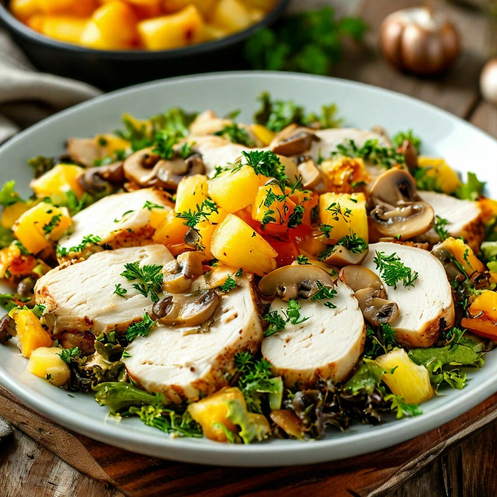 - Подача: Украсьте зеленью, выложите жареную курицу, ананасы, грибы, обжаренный лук и сыр. Добавьте майонез по вкусу , посолите и поперчите по вкусу и подавайте к столу.
