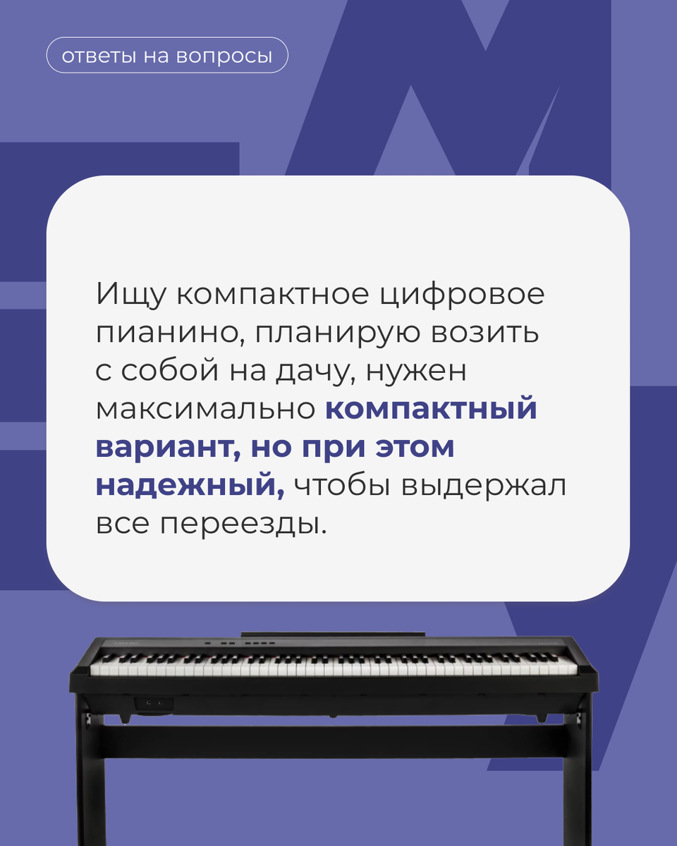 Ищу компактное цифровое пианино, планирую возить с собой на дачу, нужен максимально компактный вариант, но при этом надежный, чтобы выдержал все переезды. Мы рекомендуем модель Casio CDP S110. Это самое компактное цифровое пианино, у которого сохранена полноразмерная взвешенная клавиатура с молоточковым механизмом. Неубиваемая, непотопляемая, как линейный крейсер. Этот десятикилограммовый инструмент можно спокойно перевозить без чехлов на заднем сидении автомобиля, брать с собой на концерты, носить в руках, только не под дождем. Больше информации о пианино в нашем телеграм канале. Наши специалисты проконсультируют вас по всем вопросам, подберут идеальное цифровое пианино под ваш запрос, без навязывания ненужных аксессуаров и другой ерунды. Крутые инструменты в каждый дом