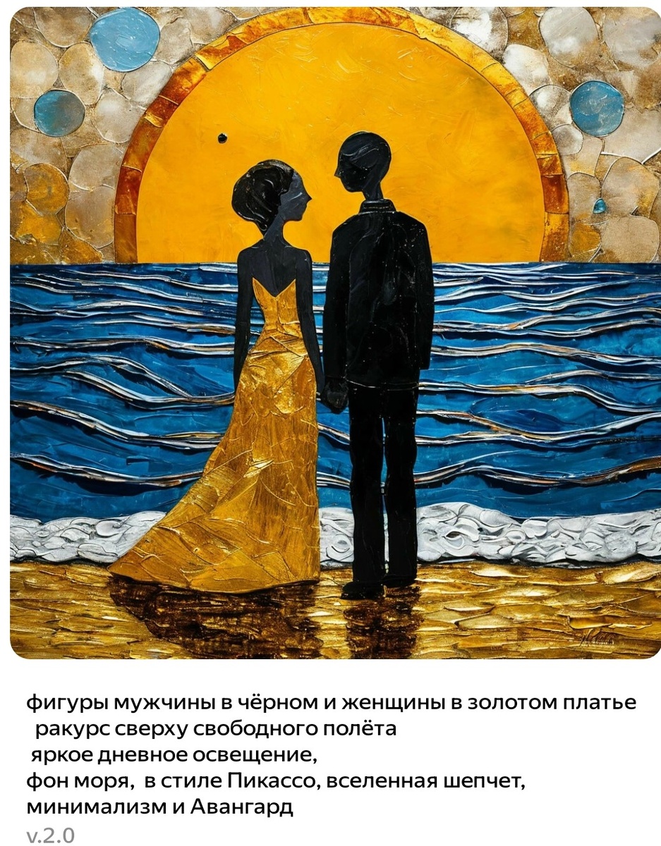 Продолжаем эксперименты со стилями в Шедеврум. Напомню, что в промте меняем описание стиля, техники, исполнения, некоторые детали, но общие объекты остаются неизменными: мужчина, женщина, фон моря. Поехали! Жаль, что ракурс не был учтён, с ним обычно интереснее получатся. Можно к описанию добавить подробно про линию волн, поскольку она получается примитивно прямой. А для стиля Пикассо хотелось бы большего искажения фигур. Настоящий Пикассо выглядит привлекательнее. Искусство росписи тканей, батик бывает более нежным, переходы тонов цепляют своим разнообразием. Нейросети такого эффекта не дают, сколько бы не уточняла в промте. Кажется, с батиком Шедеврум не особо знаком. Хотелось увидеть стилистику и атмосферу 19 века, вышивку золотом на тёмном фоне. Кстати, стили определённых временных периодов и конкретных стран, Шедеврум передаёт неплохо. Это, конечно, не Кандинский. Но, хотя бы, барельеф. Абстракции тоже не видно. Шедеврум хорошо понял и применил цвета, не забыв о сусальном золоте.