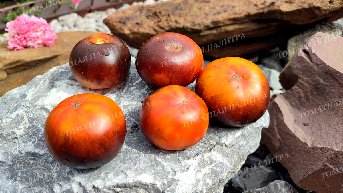 Это чудо оранжево-охрового цвета с шапочкой из густого антоциана, который растекается по бокам томата широкими полосами.