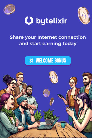 Изображение является рекламой услуги под названием bytelixir. Основной текст гласит: Поделитесь своим подключением к Интернету и начните зар