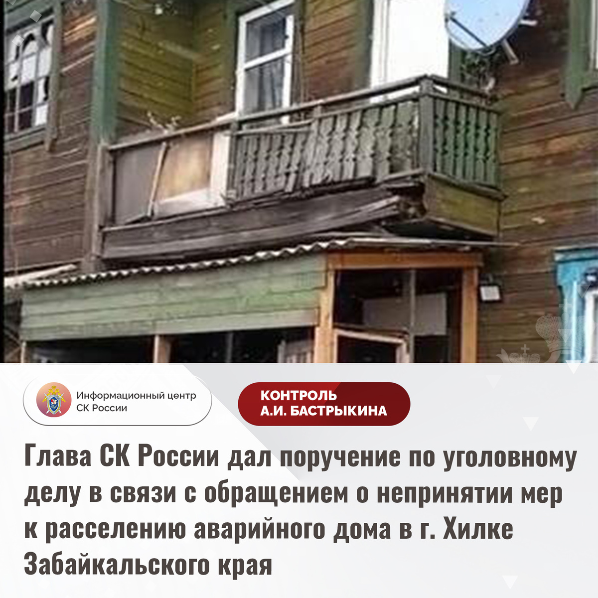 Глава СК России дал поручение по уголовному делу в связи с обращением о непринятии мер к расселению аварийного дома в г. Хилке Забайкальского края В Информационный центр СК России поступило обращение о несогласии с ходом установления обстоятельств непринятия мер к расселению многоквартирного дома, 1936 года постройки, в городе Хилке Забайкальского края. Здание, признанное аварийным в 2020 году, находится в непригодном состоянии: прогнили полы, обваливается потолок, изношена электропроводка. Срок расселения жильцов установлен до 2028 года, с чем они выражают несогласие. Отмечается, что гражданам предложено переселение в ветхие и неблагоустроенные квартиры, от которых они вынуждено отказались. Ранее ситуация освещалась в сети Интернет. А.И. Бастрыкин поручал представить по ней доклад. В СУ СК России по Забайкальскому краю расследуется уголовное дело. Председатель Следственного комитета Российской Федерации Александр Иванович Бастрыкин поручил руководителю СУ СК России по Забайкальскому к