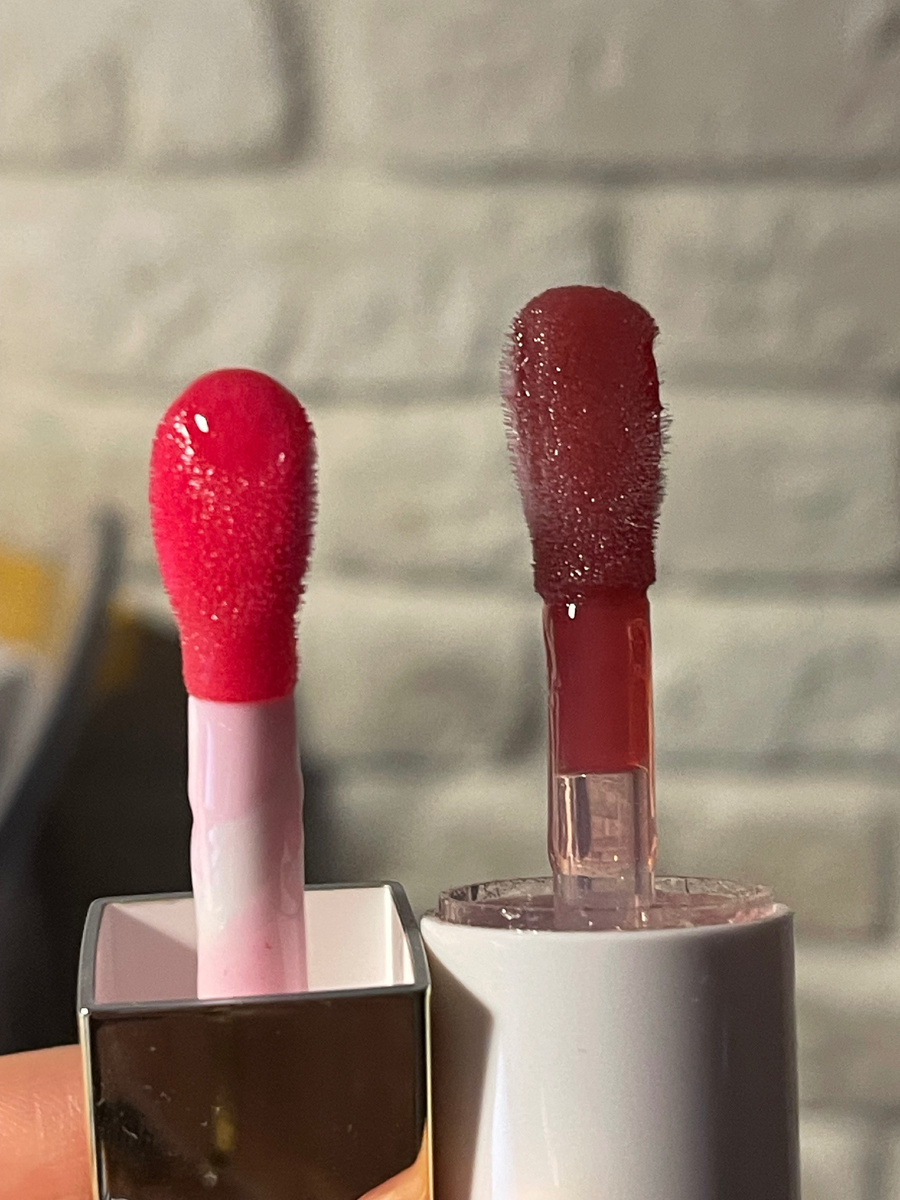 На обзоре питательное масло для губ от Летуаль fruit nectar. Упаковка самая бюджетная, небольшой флакончик из прозрачного пластика с откручивающейся белой крышкой на которой аппликатор в виде лапки, слизанный с масла Clarins, даже больше (на фото слева Clarins, справа Летуаль). Мне очень не нравится, что когда достаешь аппликатор-он плюется, доставать рекомендую очень аккуратно. А еще очень частая история, что колпачок отклеивается от аппликатора. У меня тон 03 berry, на губах смотрится не ярко и цвет не проявляется, всего 3 оттенка, есть прозрачный. Объем 4 мл. Похоже на клюквенный сироп. Оно немного липкое, но не противно, зеркальный блеск этим и достигается волосы могут прилипнуть (они ко всему липнут), губы между собой не слипаются,пахнет ягодками с химозностью. Ложится и носится комфортно. На губах смотрится красиво. Исходя из минусов желания повторять его нет, рекомендую бренду доработать упаковку и аромат, рекомендовать не могу, есть много достойных бюджетных продуктов, п