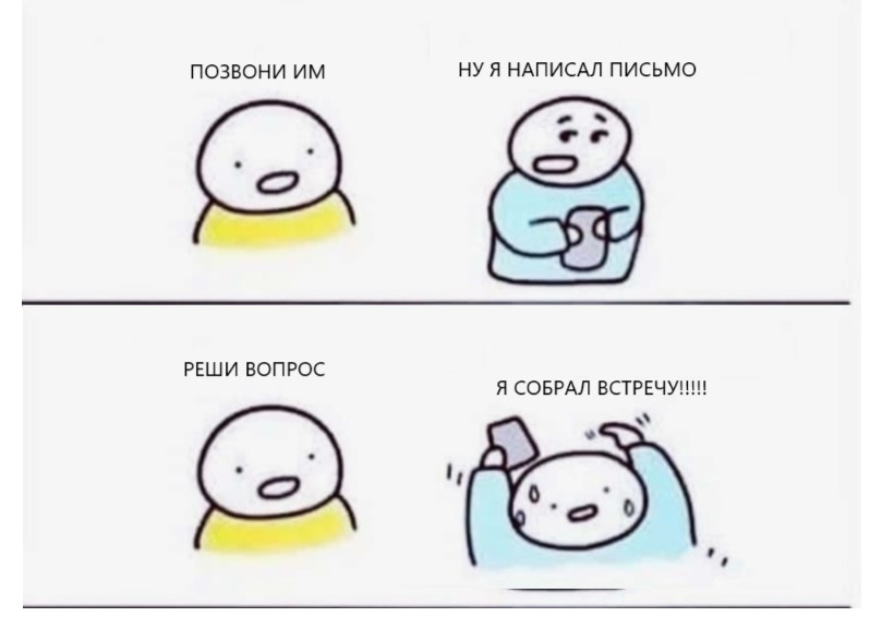 - НАПИСАТЬ ПИСЬМО. И это самый последний, самый слабый канал коммуникации. Вы не видите собеседника, вы не знаете, прочитал он письмо или нет, какая у него реакция, ответит он или нет. "Написать письмо" - это самое худшее, что вы можете сделать для решения проблемы. Отсюда и мем, вынесенный в шапку статьи