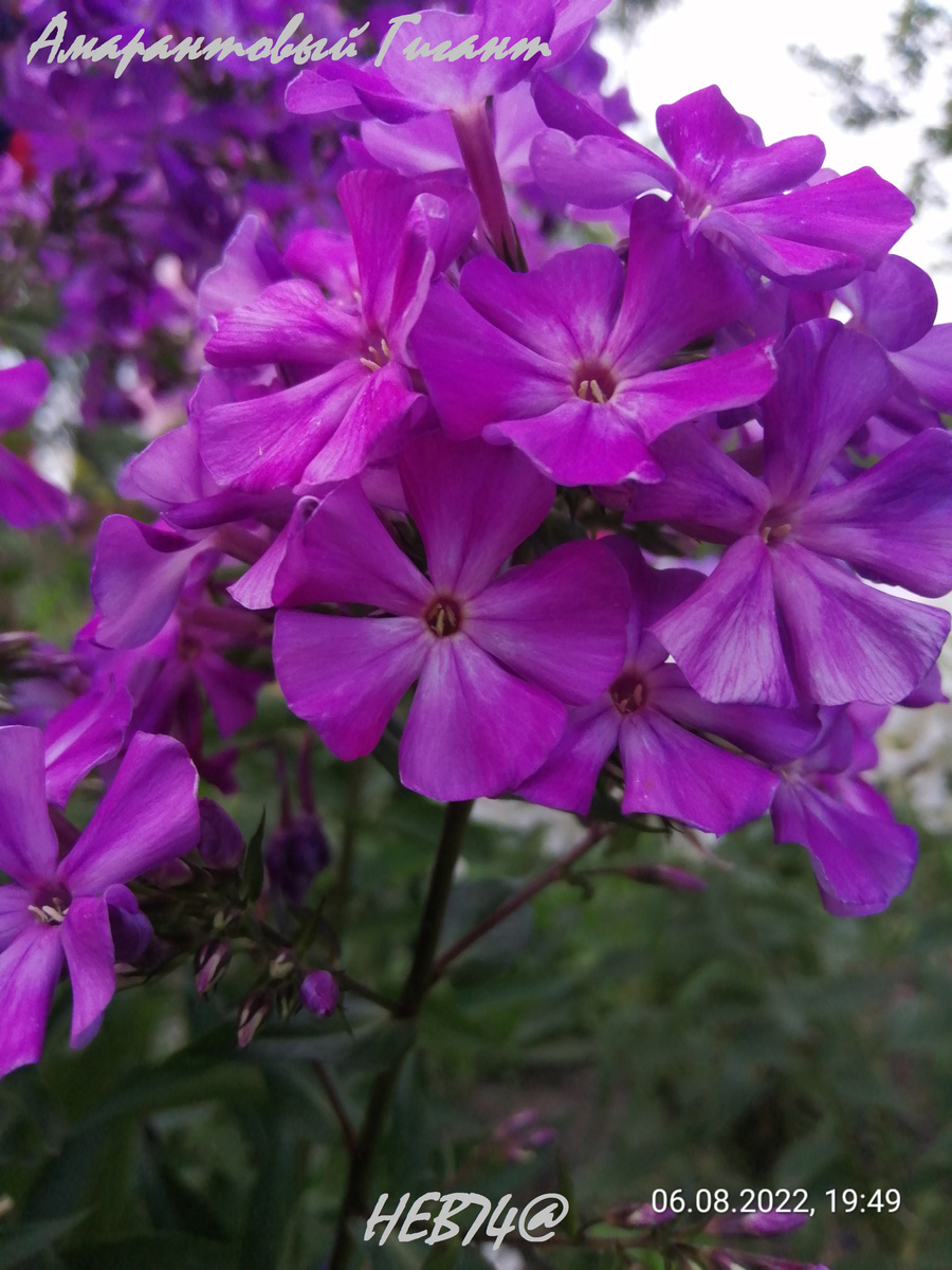1. Амарантовый Гигант, А.Ф.Чигаева, 1957г. На сайте Энциклопедия флоксов указано, что автор сорта не определён. Предположительно, авторство принадлежит Александре Федотовне Чигаевой, научному сотруднику Сибирского ботанического сада Томского государственного университета. Флокс до сих пор сохранился в коллекциях некоторых ботанических садов. Приведу описание сорта, так как оно редко встречается в источниках: цветок диаметром 3,0–3,5 см; лиловый с белым центром. По мере цветения края лепестков подворачиваются вниз. Соцветие широкопирамидальное, рыхлое, сильно ветвистое. Куст высотой 70 (до 90–120) см, прямостоячий. Сорт среднего срока цветения, зимостойкий, среднеустойчивый к грибным болезням. Я его называла «лиловым вертолётиком», долго искала название и, наконец, нашла. А вот этот флокс в Томском Ботаническом саду Характерная особенность этого флокса - темный пигментированный стебель и узкие листья. А однажды, в центре куста вырос белый флокс с такой же формой цветка – «белый вертол