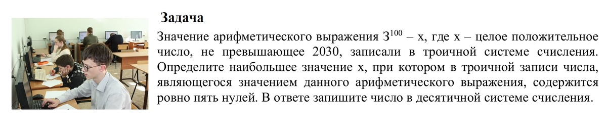 Решение: Организуем вычисления для всех возможных чисел х от 1 до 2030 for x in range(1, 2031): для каждого очередного х вычисляем значение выражения и запоминаем его в переменной f: f = 3**100 - x Инициализируем переменную k, в которую будем записывать число нулей в троичной записи значения f = 3**100 - x Пока значение выражения больше нуля while f>0: Проверяем равен ли нулю остаток от деления f на 3 если это так, то каждый раз число найденных нулей k в троичной записи увеличиваем на 1: while f>0: if f%3==0: k =k+1 Иначе отбрасываем остаток от деления f на 3: f = f//3 (целочисленное деление на 3) Как только в троичной записи числа f для очередного выбранного в цикле значения х в переменной k накопится 5 нулей, выводим значение х на экран if k==5: print(x) В результате на экран будут выведены все значения числа х, для которых в троичной записи выражения f = 3**100 - x есть 5 нулей. В ответ записываем наибольшее значение х Ответ: 2024
