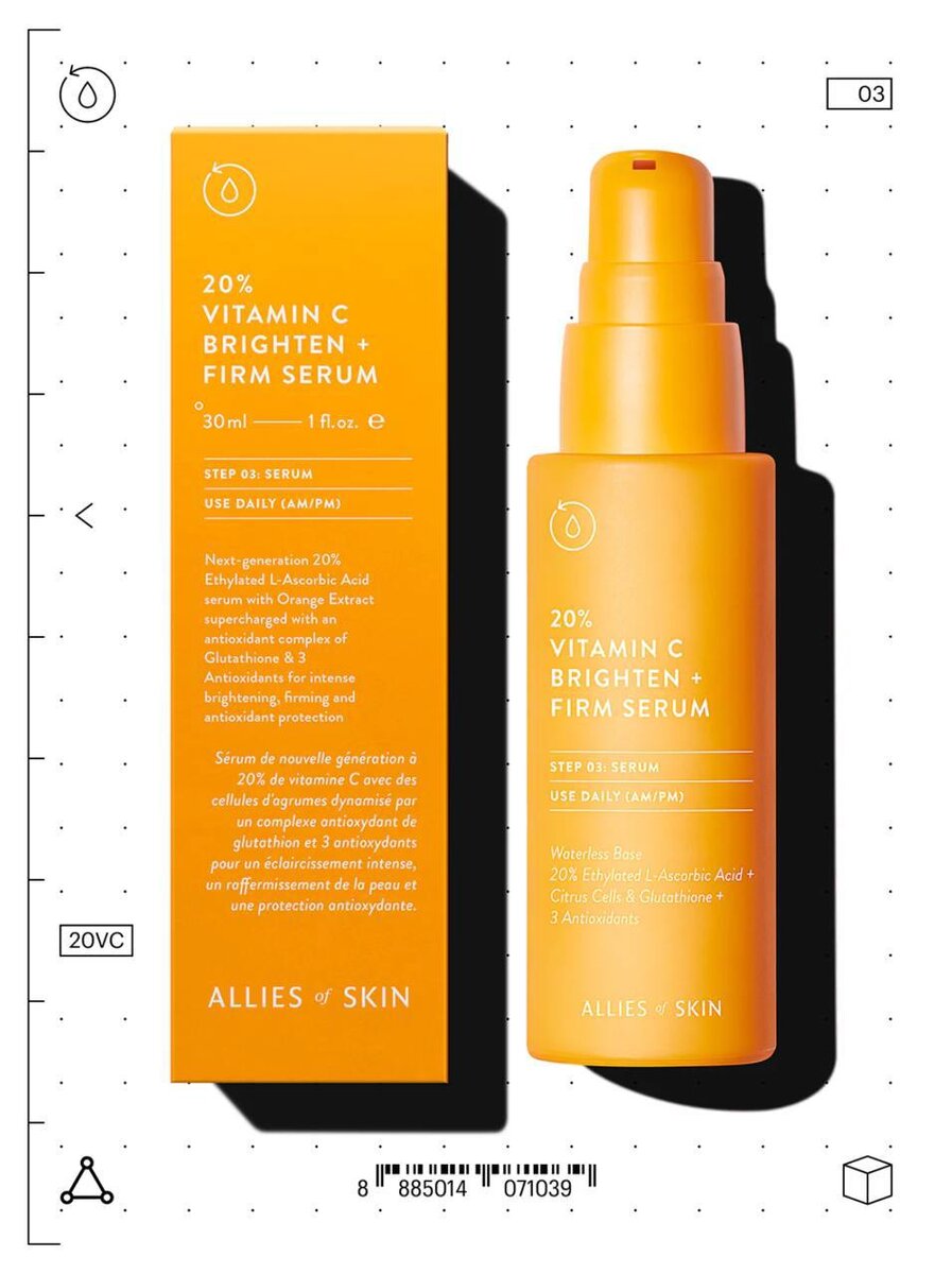 Allies of Skin – это бренд, который умело соединяет различные активные компоненты в высоких концентрациях. Банки весьма дорогие (10к-20к), но манят своими неповторимыми формулами. Начала я знакомство с сыворотки 20% Vitamin C Brighten + Firm Serum в небольшом объеме 🔸 Состав В основе сыворотки 3-O-Ethyl Ascorbic Acid - одна из самых эффективных форм витамина C при этом стабильная и подходящая почти для любого типа кожи. Так же есть другие антиоксиданты. Сложно найти средство среди брендов с такой удачной формой витамина С и в такой большой концентрации. Поэтому от этой сыворотки можно ожидать все бонусы витамина С максимально быстро и качественно, а это – улучшение тона, уменьшение пигментации, подтянутость и многое другое 🔸 Ощущения Сложность данной сыворотки заключается в её консистенции. Это что-то между подтаянным воском или силиконом (звучит как ночной кошмар). Поэтому нанося на сухое лицо (как это часто принято с данным витамином), я получила жуткий парниковый эффект, у меня з