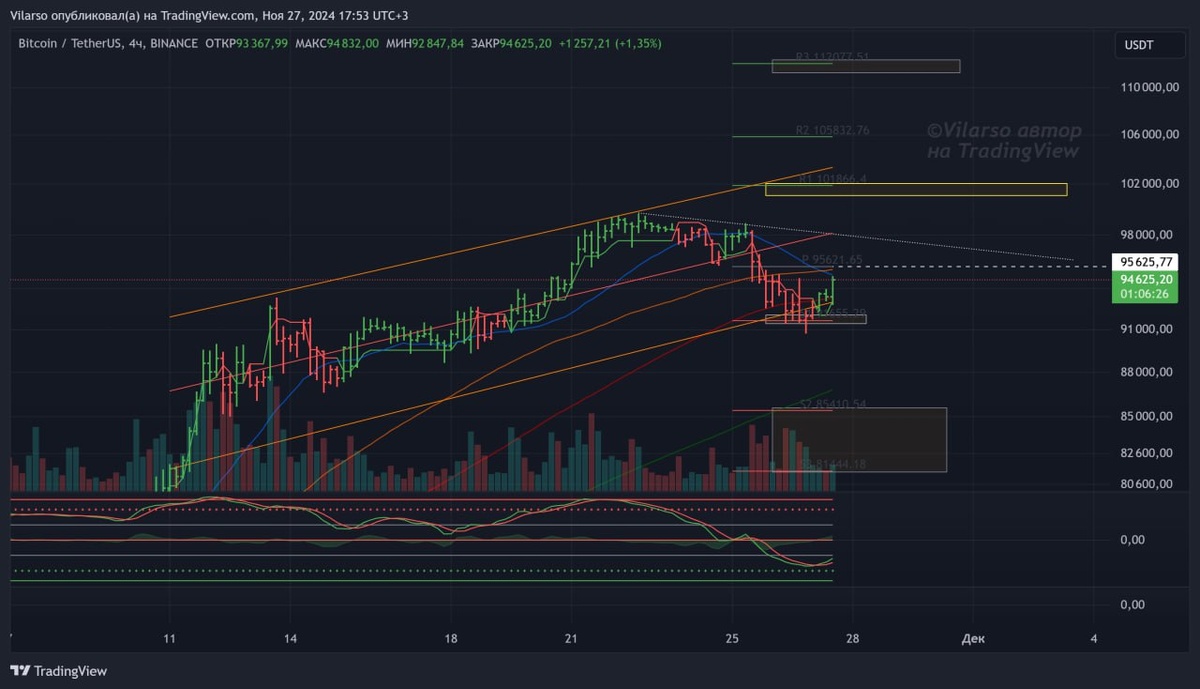 Обратите внимание, как хорошо отработал уровень поддержки $91500 от китовых лимитников, который отмечал для вас в этом видео обзоре по #BTC от 26 ноября.