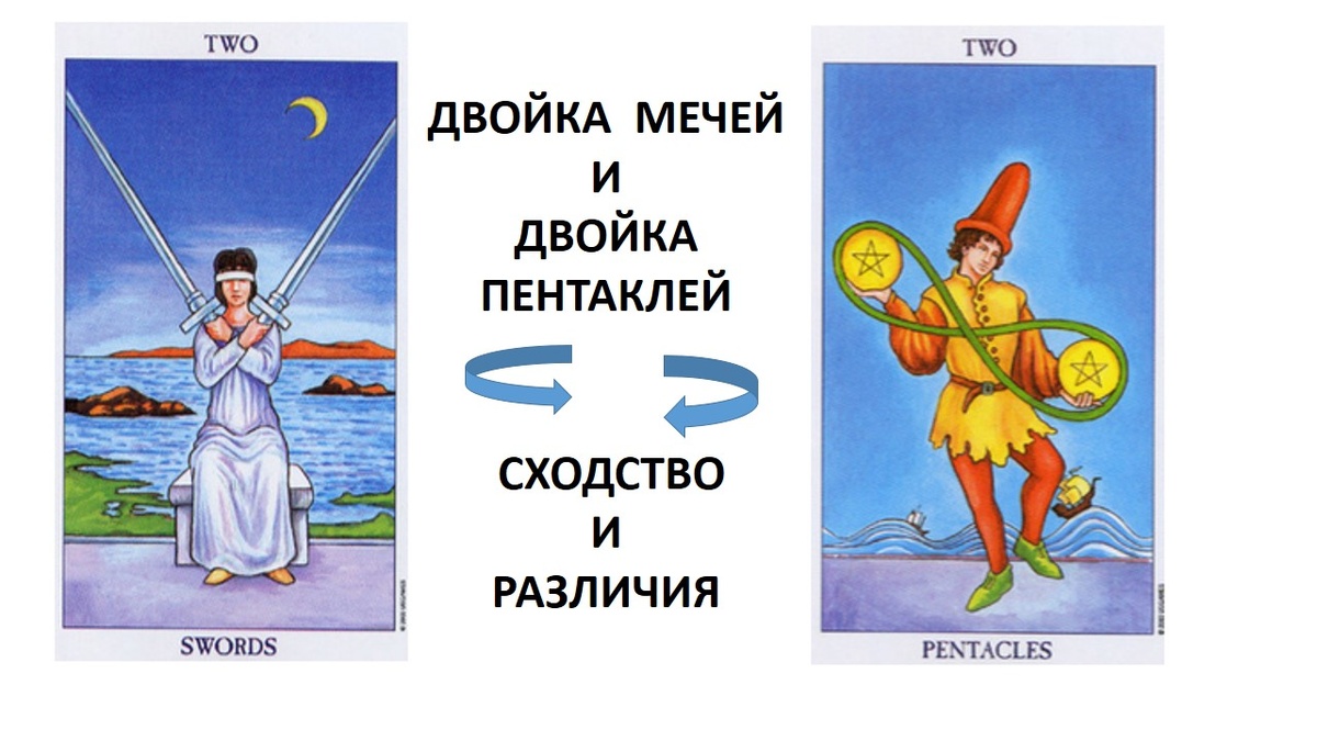 Начнем с того, что персонажи 2 мечей и 2 пентаклей по-разному подходят к ситуации выбора и по-разному себя ведут в процессе принятия решения. Давайте попробуем разобраться в этом, проанализировав изображения двух арканов и вспомнив их системное значение, складывающееся из числа и масти.