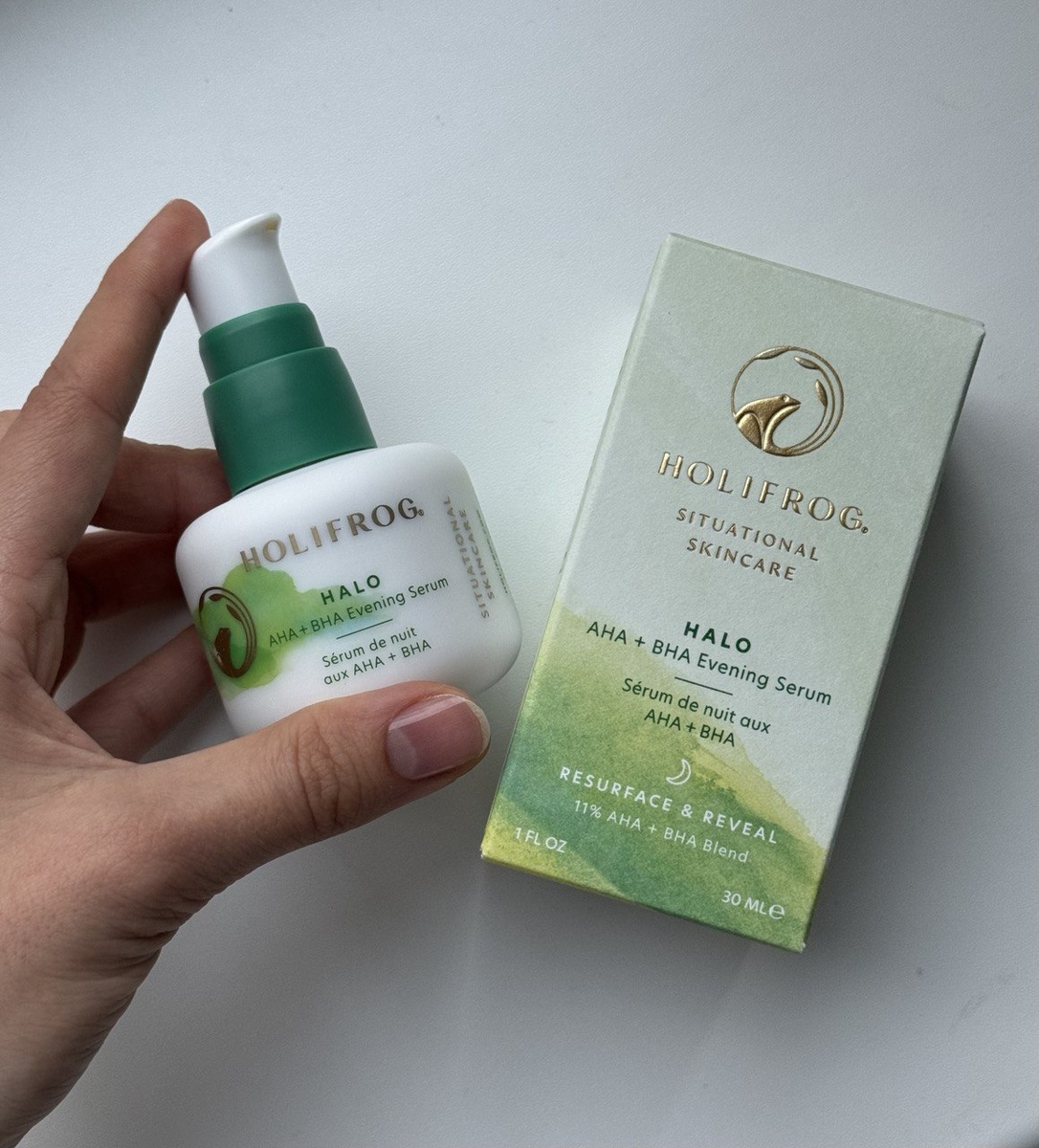 Сегодня расскажу про классное средство с кислотами, которое не только улучшило рельеф моей кожи, но и разгладило заломы, с которыми я давно не могла справиться. Сыворотка HALO с 11% AHA и BHA кислотами от Американского бренда HoliFrog 🐸 Посмотрим подробнее на ингредиенты и что от них ожидать 🌱Состав антиоксидантные, успокаивающие и восстанавливающие свойства 🌱 Ощущения Мощный состав кислот сбалансирован маслами, поэтому сыворотка получилась действенная, но не сильно агрессивная. Я перестала чувствовать пощипывания примерно на 4-й раз и сейчас спокойно использую вечером примерно 3 раза в неделю 🌱 Результат Кожа стала чище и ровнее, более свежая так сказать. И у меня действительно пропали мимические заломы на лбу, которые присутствовали пол года, несмотря на хорошее увлажнение. Я не ожидала, что такое относительно мягкое средство сможет с ними справиться. Довольна на 120% Ну и не могу не отметить эстетику баночки. Приятная и визуально, и тактильно. Да еще и эта лягушка – милота! А ка