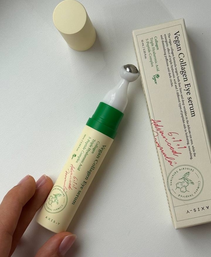 Все, конечно, слышали и не раз пробовали крема для кожи вокруг глаз. Но мне впервые попалась в руки отдельная сыворотка для этой зоны – AXIS-Y Vegan Collagen Eye Serum. Средство получилось очень приятное и вот почему 🌿 Состав: 🌿 Ощущения: Держу сыворотку в холодильнике и как же приятно с утра провести по коже холодным металлическим шариком! Это и бодрит, и хорошо убирает отеки. Само средство распределяется без проблем и быстро впитывается. Здесь отличие от крема как раз в текстуре, она более легкая и не оставляет жирности совсем 🌿 Результат: Сразу после нанесения я замечаю, что кожа напитывается, подтягивается и начинает светиться (это визуально за счет увлажнения и текстуры). По тестам компании, также наблюдался и накопительный эффект спустя 2 недели: кожа под глазами становится светлее и глубина морщинок уменьшается Мне было действительно приятно использовать это средство. Невероятной магии не сделает, но сразу придаст свежесть взгляду, поможет замедлить возрастные изменения и при