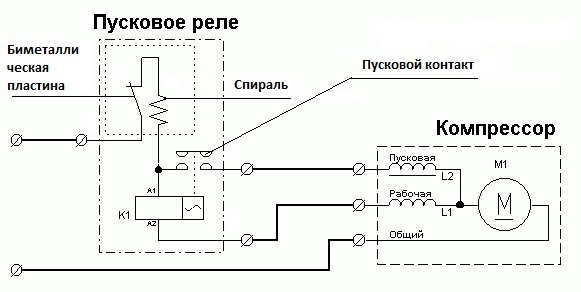 Если мотор не перегревается, то замена пускового реле решит проблему. Если же есть перегрев, значит, нужно менять компрессор. Замена реле в данном случае будет устранением последствий, а не причины. Реле холодильника — схема подключения и как проверить на работоспособность Любое современное электромеханическое оборудование оснащено специальными устройствами, регулирующими его работу и защищающими от перегрузок. В холодильниках любых производителей таким устройством служит пуско-защитное реле. Схема подключения пускового реле Данное устройство необходимо для запуска однофазного асинхронного эле