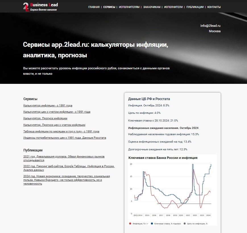 Запущен новый раздел нашего сайта - Сервисы / app.2lead.ru Вы можете рассчитать уровень инфляции российского рубля, ознакомиться с данными органов власти, и не только. Будем рады видеть вас на страницах app.2lead.ru