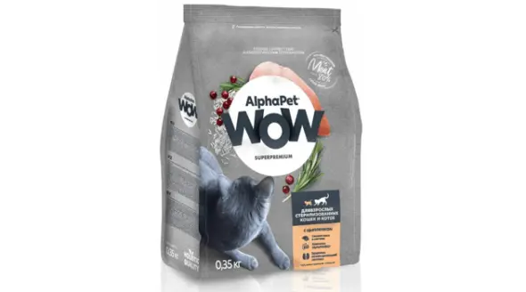 Очередное место в рейтинге занимает корм AlphaPet WOW. Он предназначен для взрослых кошек в возрасте от 1 до 6 лет и рекомендован для стерилизованных и кастрированных домашних любимцев. Также его можно использовать в качестве ветеринарной диеты при заболеваниях опорно-двигательного аппарата. Основным компонентом является птица, а также в состав входят злаковые.