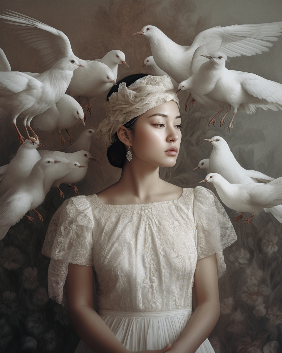 /imagine prompt: A woman with white doves perched atop her head, ethereal and serene, soft white dress, delicate and intricate details, soft natural light, minimal background, highly detailed and surreal --ar 4:5 --v 5 --q 2 --style surrealism /imagine prompt: A woman adorned with a large, intricate headdress made of white flowers, ethereal and dreamlike, delicate lace dress, soft and subtle lighting, minimalistic background, surreal and highly detailed --ar 4:5 --v 5 --q 2 --style fantasy /imagine prompt: A woman with a headdress made out of fluffy dandelion seeds, standing in a field of dandelions, ethereal and whimsical, soft pastel dress, warm natural sunlight, highly detailed and surreal --ar 4:5 --v 5 --q 2 --style ethereal