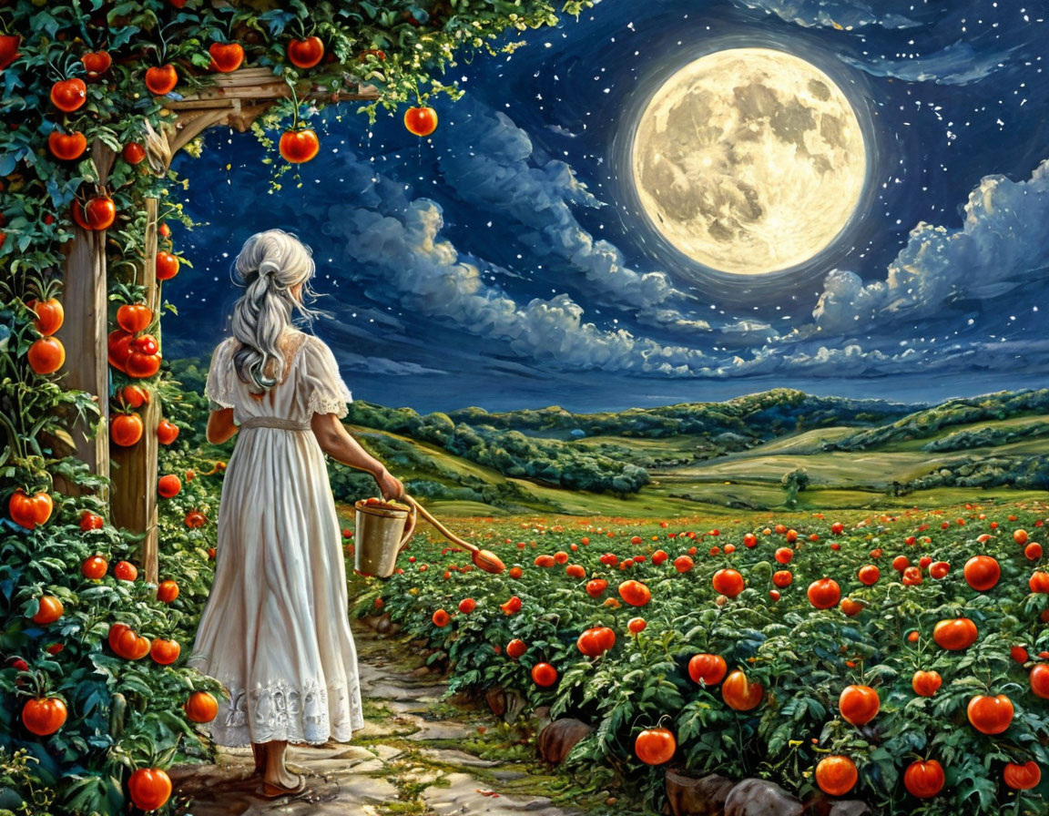 Никакие дедушкины уговоры и убеждения, что все можно сделать рано утром не помогли, и бабушка Маша поспешила в огород спасать урожай. Она уже почти легла спать, поэтому была в длинной белой ночной сорочке и с распущенными развивающимися волосами. На небе сияла полная Луна, а бабушка ходила по огороду между грядок и со всем тщанием брызгала веником помидоры.