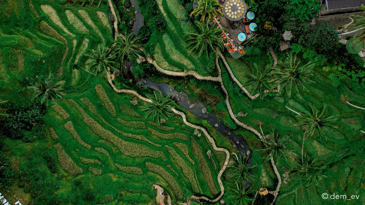 Террасные поля (на местном языке называются "субак") — это древняя система земледелия, возникшая на Бали тысячи лет назад. Чтобы выращивать рис в условиях гористой местности, балийцы разработали уникальные системы террас. Эти каскады полей расположены на склонах гор, где каждая терраса имеет идеально выровненный уровень, что позволяет воде плавно стекать по ним. Важную роль играет традиционная система ирригации, управляемая сообществами фермеров и храмами. Она направляет воду из рек и горных источников на поля, поддерживая постоянный уровень влажности, необходимый для выращивания риса.