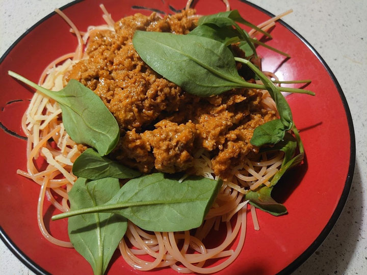 ✔ Спагетти из красной чечевицы - 70 г в сухом виде; ✔ Вода - 400 мл для приготовления спагетти; ✔ Фарш из бедра индейки - 300 г; ✔ Масло оливковое – 1 ст. л.; ✔ Лук репчатый - 1 шт.; ✔ Сметана 10 % - 2 ст. л.; ✔ Томатная паста - 2 ст. л.; ✔ Сыр тёртый - 70 г; ✔ Базилик - 10-20 г.; ✔ Шпинат - 10-20 г.; ✔ Специи - по вкусу; ✔ Соль - для приготовления спагетти. В составе спагетти из чечевицы – только мука из красной чечевицы и вода. Спагетти отварить по инструкции (я варю не более 5 минут). Фарш обжарить в сотейнике на оливковом масле, добавить сметану, томатную пасту, лук, мелко нарезанный базилик и специи по вкусу. При необходимости добавить кипятка. К отварным горячим спагетти добавить тёртый сыр, сверху - фарш с соусом и шпинат. Получается 3 порции. КБЖУ на 100 г - 116, 4/10,1/6,1/5,9. К спагетти - салат из квашеной капусты, помидора, лука, киви, шпината и растительного нерафинированного масла, ~100-150 г. Рецепт на странице Автор рецепта – Галина Сасыкова Расчёт КБЖУ сделан с помощью
