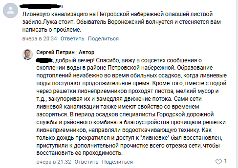 Петровская набережная в период осадков погружается под воду, это создает большие трудности для передвижения, провоцирует заторы. В последние дни «Блокнот» получает частые жалобы на этот участок дороги. Не только наших читателей беспокоит подтопление данной территории, но и подписчиков мэра Сергея Петрина. В соцсетях главе города так написали о проблеме: «Ливневую канализацию на Петровской набережной опавшей листвой забило. Лужа стоит. Обыватель Воронежский волнуется и стесняется вам написать о проблеме». Мэр отметил, что видит сообщения о скоплении воды в этом районе. Но видеть - этого мало, надо еще как-то устранять постоянные лужи. Подтопления же Петрин назвал неизбежными: «Образование подтоплений неизбежно во время обильных осадков, когда ливневые воды поступают продолжительное время. Кроме того, вместе с водой через решетки ливнеприемников проходят листва, мелкий мусор и т.д., закупоривая их и замедляя движение потока. Сами сети ливневой канализации также имеют свойство со временем