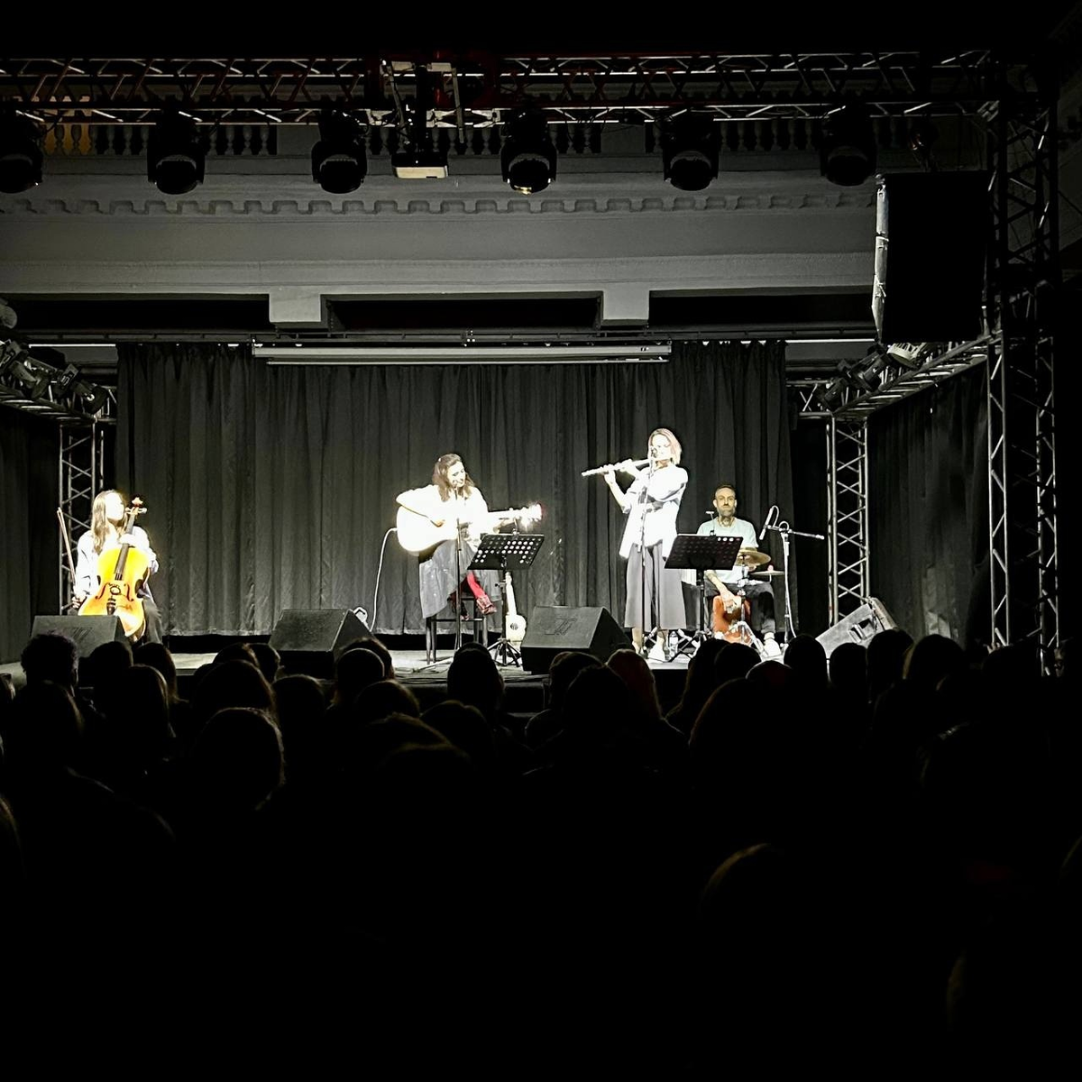 Звук в ДКРТ, конечно, отличный. Ждали одну акустическую гитару, а приехал целый ансамбль: виолончель, перкуссия, флейта, гитара, укулеле и даже... треугольничек. Представляете?