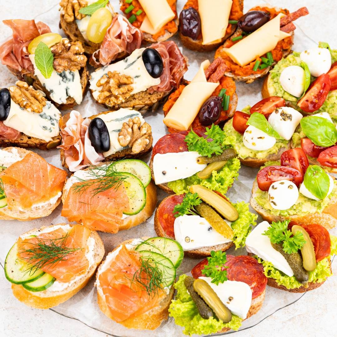 ☝️ Совет: моцареллу можно заменить вареными перепелиными яйцами или вареными или жареными креветками. В бутерброды можно добавить перья красного лука, оливки или салат из рукколы или Рапунцель.