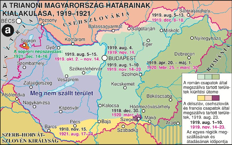 Это продолжение цикла о формировании современных границ Венгрии. Начало – здесь. Как видно на карте выше, к осени 1919 г. лишь западная часть Венгрии не была оккупирована соседями (черным показаны даты начала оккупации, а красным – ее окончания). По Сен-Жерменскому договору 10 сентября 1919 г. Бургенланд (Őrvidék по-венгерски) должен был отойти Австрии. В этом регионе, населенном преимущественно немцами, еще в декабре 1918 г. была провозглашена Республика Хайнценланд, которая просуществовала два дня: приехали венгры на бронепоезде и разогнали. Теперь же Антанта повелела Венгрии освободить Бургенланд к 19 августа 1921 г. Между тем, еще 30 мая 1919 г. в оккупированном французами Сегеде на юге Венгрии было сформировано антикоммунистическое правительство графа Дьюлы Каройи (не путать с Михаем, тоже графом). Военным министром в нем стал адмирал Миклош Хорти, последний командующий флотом Австро-Венгрии , который приступил к формированию Национальной армии (Magyar Nemzeti Hadsereg). После