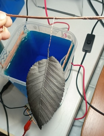 Убираем проволочку, которой наша заготовка крепилась к катоду - обламываем омедненный черешок листа либо наполовину, либо до основания - всё зависит от вашей дальнейшей идеи. Я оставляю часть черешка. Вдруг после отжига обнаружатся дефекты, и заготовку придется еще раз отправить в ванну на домеднение - будет к чему прикрепить проволочку. А, возможно, мой листик и в изделии останется с черешком.