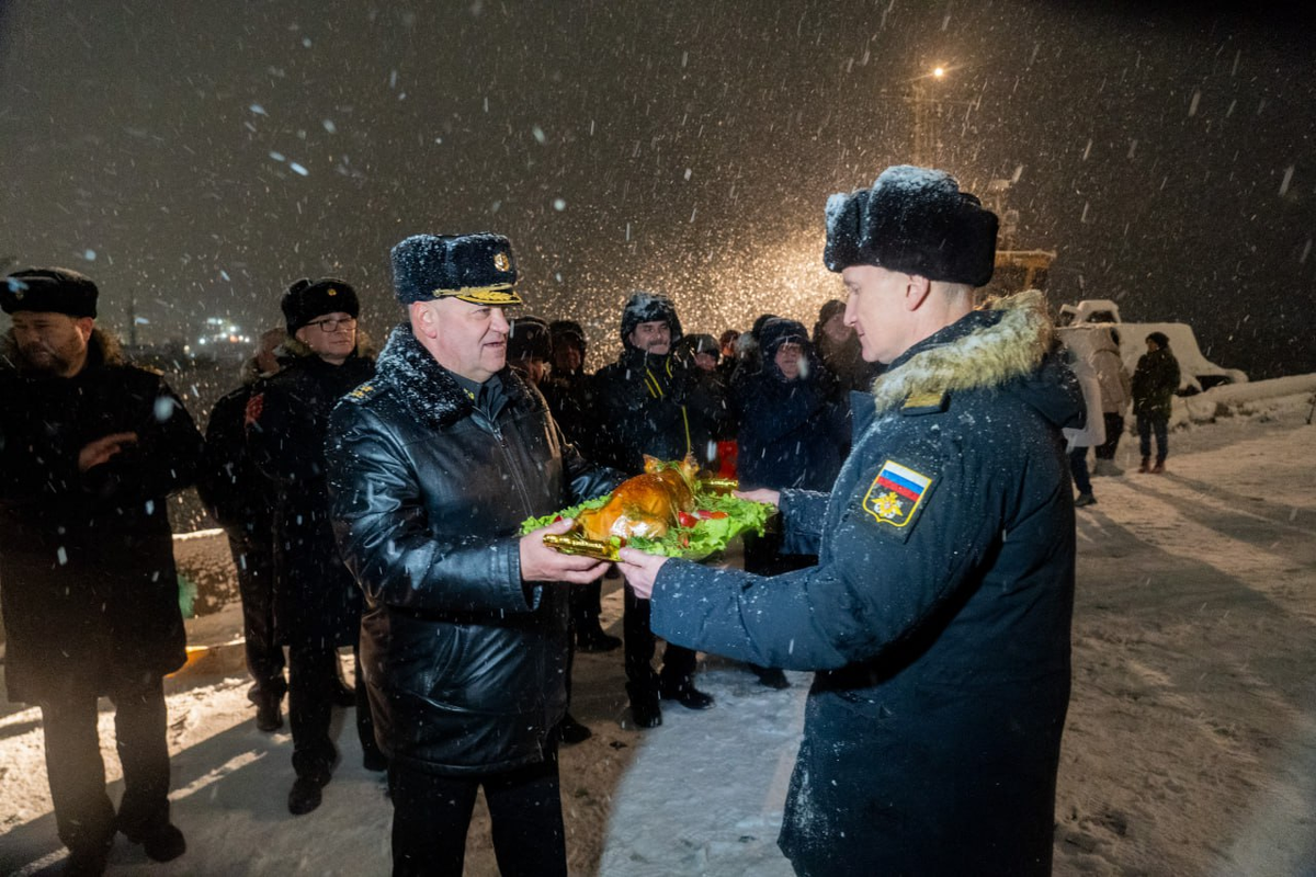 В порт приписки Мурманск из дальнего похода возвратился средний морской танкер Северного флота «Академик Пашин», решавший задачи материально-технического обеспечения кораблей и судов Военно-Морского Флота России в различных районах Мирового океана. ⚓️ Швартовка судна к мурманскому причалу вспомогательного флота проходила в сопровождении военного оркестра Центра материально-технического обеспечения Северного флота. На причале моряков встретил заместитель командующего Северным флотом по материально-техническому обеспечению вице-адмирал Дмитрий Украинец, родные и близкие членов экипажа. 💬 От имени командующего Северным флотом вице-адмирала Константина Кабанцова Дмитрий Украинец поздравил моряков с возвращением домой, поблагодарил за успешное выполнение всех поставленных задач дальнего похода, вручил грамоты и традиционного жареного поросёнка. «Приятно было слышать тёплые слова от Главнокомандующего Военно-Морским Флотом России в отношении экипажа танкера, о высоком мастерстве и професси