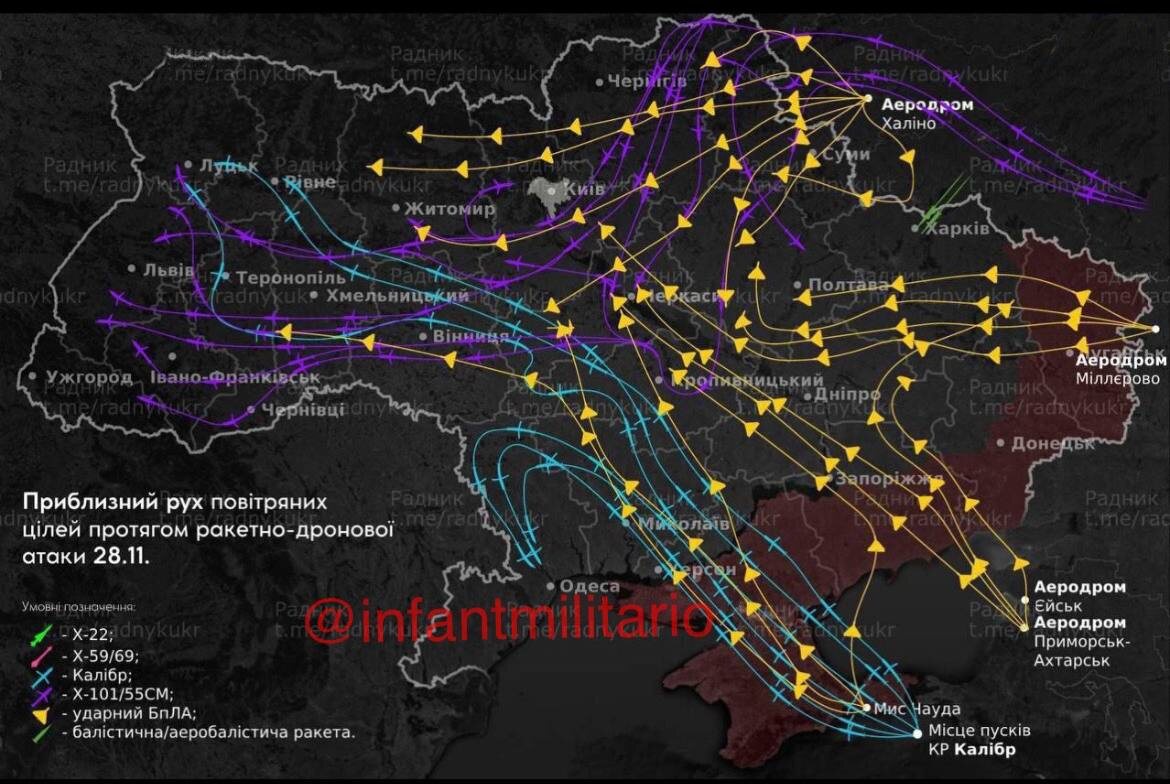 В ходе сегодняшнего российского удара по Украине было выпущено более 90 ракет. Такую статистику приводит в своей сводке командование Воздушных сил ВСУ, передает корреспондент «ПолитНавигатора», Утверждается, что сбито 76 из 85 крылатых ракет Х-101/ «Калибр», три из трех ракет Х-59/69, 35 из 97 БПЛА и ни одной из трех ракет С-300. То есть, если даже принять на веру традиционно завышенную в свою пользу статистику от ВСУ, то 12 ракет украинская ПВО поразить не смогла, не говоря уже о беспилотниках. Как результат, ряд регионов Украины обесточен. По сообщениям местных властей, в Львовской области более 500 тысяч абонентов остались без электроснабжения, на Волыни – более 215 тысяч. Начались перебои с электроснабжением в Житомире, Хмельницкой области. В Ровенской области без электроснабжения 681 населенный пункт. «Пожалуй, «выключить свет», сейчас лучшее решение из возможных. Свет, интернет и т.д. Странно, что для подобных ударов не используют то самое наше чудо-оружие, в комплексе эффект был