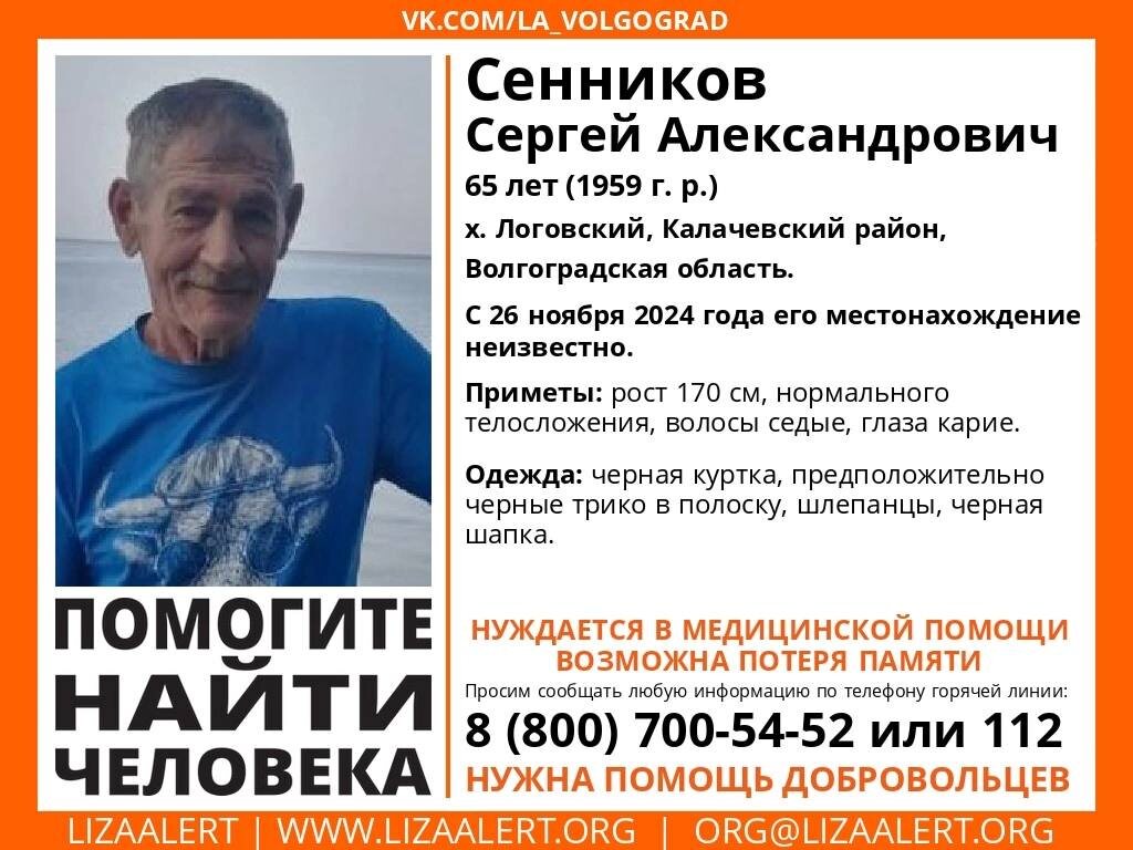 В Волгоградской области пропал без вести 65-летний Сергей Сенников. Поиски объявил отряд «Лиза Алерт». Мужчина ушел из дома в хуторе Логовском Калачевского района, со вторника, 26 ноября о нем нет никаких известий. Сергей Александрович весьма высокий, кареглазый. Он был одет в черную куртку и предположительно в черные трико в полоску, шлепанцы и черную шапку. Сложность ситуации в том, что пропавший без вести нуждается в медицинской помощи, у него возможна потеря памяти. Для его поисков нужна помощь добровольцев, а любую информацию можно сообщить в правоохранительные органы. Также в регионе продолжаются поиски еще двоих мужчин. Так, 54-летний Андрей Дементьев в желтой куртке пропал 22 ноября в поселке Новый Рогачик Городищенского района. А 58-летний Вячеслав Викторов из Волжского был одет в красную куртку. О нем нет известий с 16 ноября. У нас есть закрытый телеграм-канал, там много интересного! Подписывайтесь Анна Анатольева
