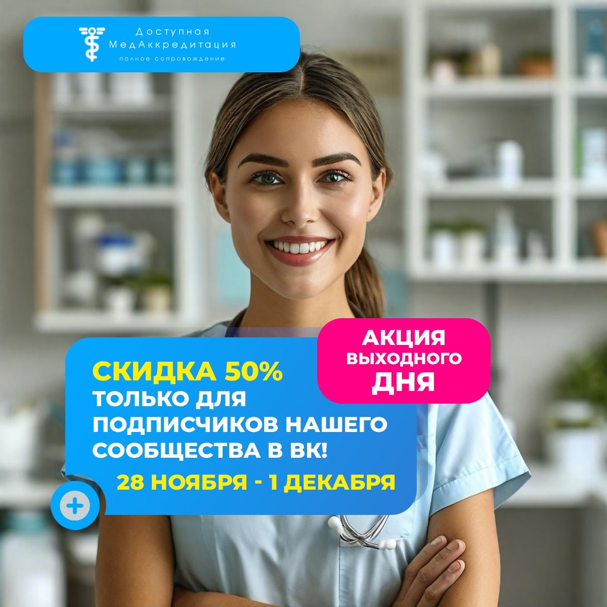 Скидка -50% на обучение и подготовку к периодической аккредитации! Только 4 дня - 28 ноября-1 декабря! Повышать квалификацию, проходить периодическую аккредитацию обязан каждый медработник! Но работодатель за это не платит! Не упустите возможность сделать это максимально выгодно! Подпишитесь на наше сообщество https://vk.com/med_akkred и получите скидку -50%! Скидка действует на следующие услуги: •повышение квалификации от 36 до 144 часов (с начислением ЗЕТ) •профессиональная переподготовка •подготовка к периодической аккредитации - все пакеты! Со стоимостью услуг (указаны без скидки) вы можете ознакомиться на странице нашего сообщества https://vk.com/med_akkred Для консультации и оформления услуги со скидкой : 1 Звоните 8 (848) 237-94-45 2 Пишите в WhatsApp/Telegram/Viber 89913962958 3 Пишите на почту nmfosale@med-akkred.ru 4 Пишите сообщения в сообщество https://vk.com/med_akkred