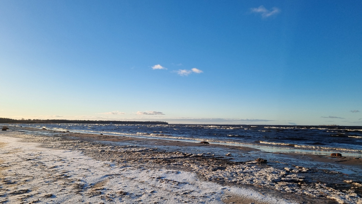 Этот маршрут подойдет для любителей спокойной прогулки и для отдыха на морском побережье. Километраж 14 км, есть точки схода и раньше. Приглашаю прогуляться, отвлечься от городской суеты и повседневности. Прогулка начинается от ж/д станции Курорт, куда можно доехать на электричке с Финляндского вокзала или на автобусе. На этой станции находится знаменитый санаторий «Сестрорецкий курорт» с красивым парком, но с января 2023 года здания санатория находятся на реконструкции и пройти через парк к воде не получится. Ничего страшного, если обойти забор слева, то выйдешь на песчаный пляж. Широкая песчаная полоса простирается на несколько километров. А воды Финского залива кажутся бескрайними. Направо - Солнечное. А мы держим путь налево, в сторону парка Дубки в Сестрорецке. На побережье ветрено, волны с шумом подкатывают и растворяются на песке. Песчаный берег от мороза застыл, образовав интересный узор. На пляже единичные отдыхающие, такие же «охотники» до прогулок. Снежный покров совсем нез