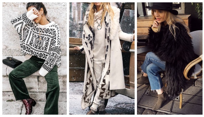 Стилисты покажут нам примеры того, как любительницам бохо стиля можно одеваться в холодное время года. В данной статье вы увидите, какие элементы одежды и аксессуары можно комбинировать, чтобы создавать наряды в вашем любимом стиле. Первый вариант образа — укороченное пальто в клетку с меховым воротником, макси платье из легкой ткани в контрастном принте, шапка из меха в стиле 70-х и замшевые ковбойские сапоги, выглядит максимально впечатляющим и стильным. Следующий look также включает в себя клетчатое укороченное пальто с меховым воротником, которое гармонично перекликается с велюровыми брюками кирпичного цвета, а также объемным вязаным светлым свитером с высокой горловиной и тематическими узорами. Светлая замшевая шляпа и кожаные ковбойские ботинки с необычным рисунком — стали идеальным завершением шикарного образа. Разноцветная меховая одежда + длинная кружевная накидка + полосатый комбинезон + полосатая водолазка + светлый берет + цветные кроссовки на белой подошве — необычный мно