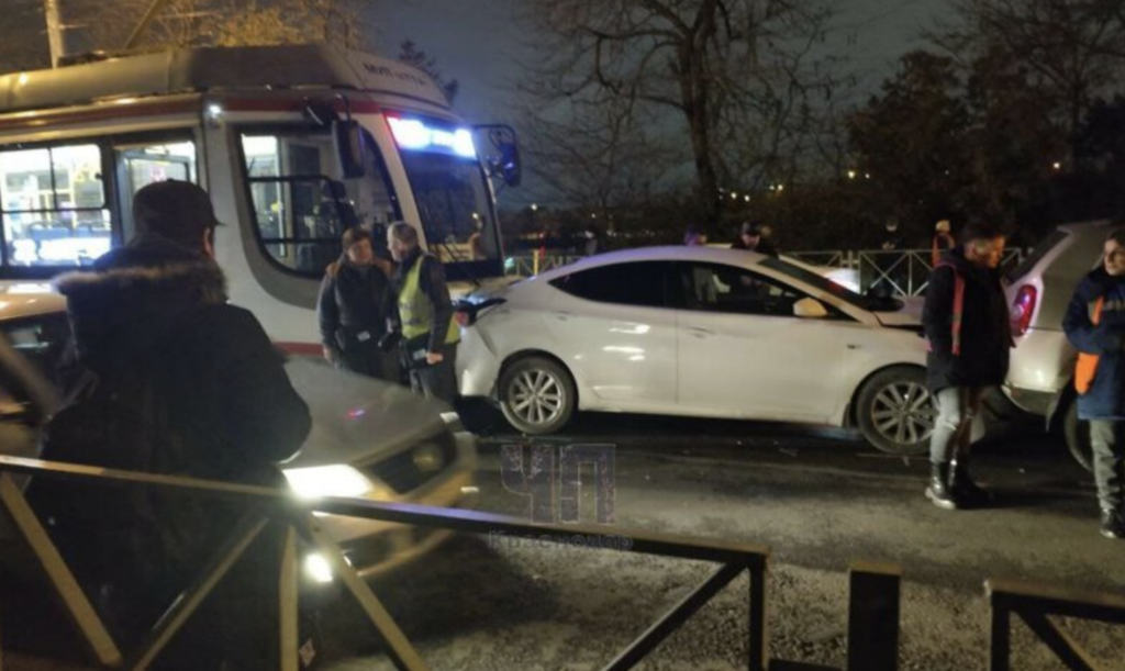 По предварительным данным, водитель трамвая не выдержала безопасную дистанцию до ехавшего впереди Hyundai и протаранила его. От удара иномарка столкнулась с Renault, который отлетел и врезался в Mercedes.