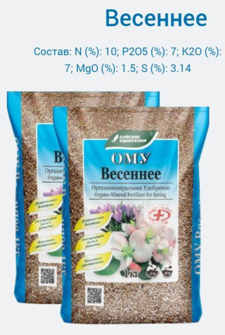 В его составе повышенное содержание азота, как раз для весеннего старта растениям. Я им удобряю и цветы и плодовые кусты и деревья. Мне хватает 3-4 упаковки, оно не дорогое.
