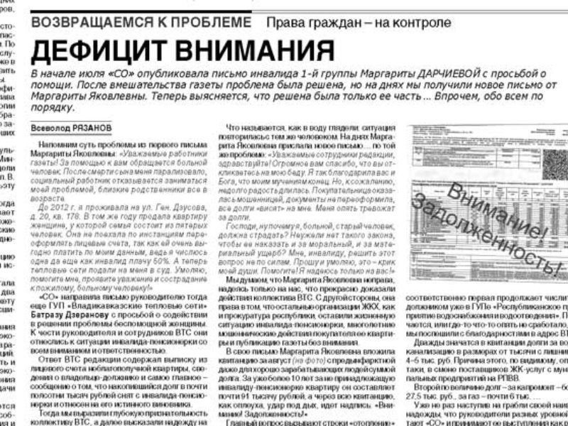 В конце октября, 28-го числа, в статье "Дефицит внимания" "СО" вернулась к трудной жизненной ситуации, в которую попала инвалид 1-й группы Маргарита ДАРЧИЕВА. Повторное обращение к теме было вызвано ее новым обращением в газету за помощью в решении все той же, но еще более усугубившейся, проблемы. После второй публикации "СО" направила письмо в ГУП РПВВ с просьбой помочь инвалиду. На днях мы получили ответ от организации.