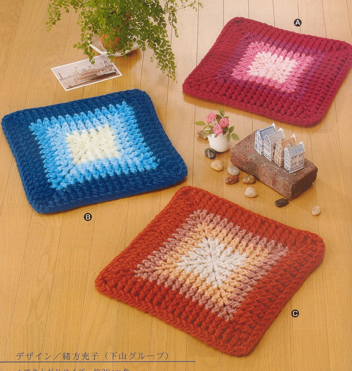 Оригинальные узоры, мотивы использованы для вязания крючком этих мини ковриков. В данных узорах отлично сочетаются различные цвета, поэтому в дело можно использовать остатки пряжи. Квадратный мотив связанный рельефными столбиками вяжется просто и этот принцип вязания можно использовать для вязания чехлов на квадратные табуреты, ковриков, пледов и покрывал. Квадраты с рельефным рисунком можно вязать любого размера, а на основе схемы квадрата легко вязать и прямоугольные полотна с любой длиной. Для вязания прямоугольника нужно набрать цепочку воздушных петель и обвязать её по кругу, сформировав углы как у квадрата на первой и последней петле цепочки. Видео вязания квадрата с рельефным узором тут. Объёмный и пышный круглый мини коврик с узором шишечек в центре и двуцветной косой по контуру привлекает внимание. Как вязать коврик с косами смотрите тут Коврик из мотивов цветов напоминает цветочную полянку. Мотивы цветы пришиваются на основу. Так можно вязать декоративную подушку или коврик