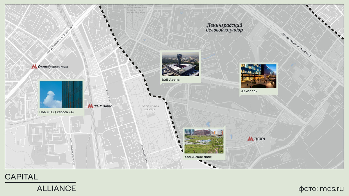 В районе улицы Зорге активно идет развитие жилой среды, появляются современные проекты. Развитие офисного потенциала локации — сравнительно новый тренд, который подпитывается востребованностью предложения в Ленинградском деловом коридоре. И у локации, где ведет работу по строительству нового бизнес-центра класса «А» девелоперская компания Capital Alliance, отличные перспективы: с одной стороны — быстрый выезд на Ленинградский проспект в обе стороны, с другой — практически прямой пятиминутный выезд на Звенигородское шоссе, ведущее на Новорижское шоссе и развивающиеся Мнёвники, и на улицу Алабяна — часть Северо-Западной хорды.