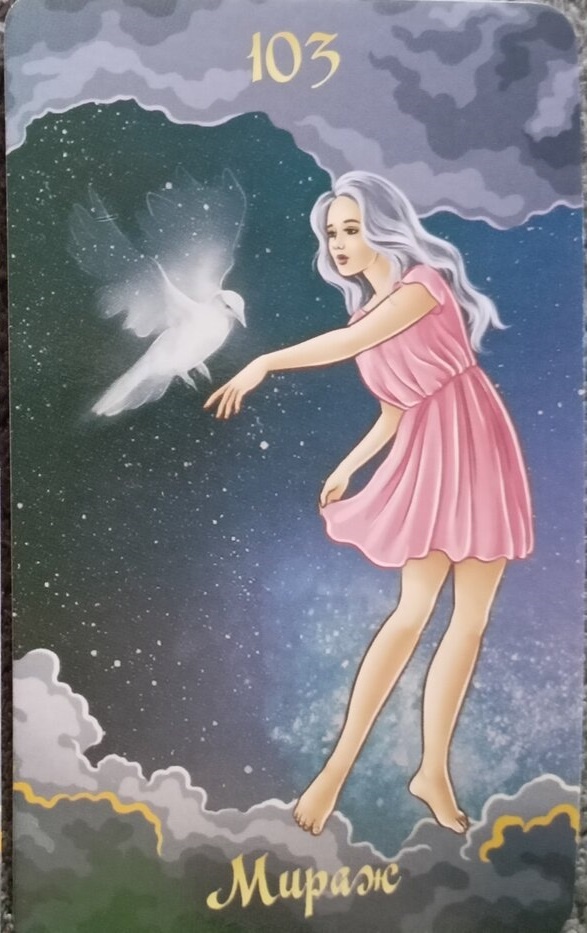 Карта Мираж это сто третья карта колоды, которая обозначает иллюзии, жизнь в розовых очках, мечты.