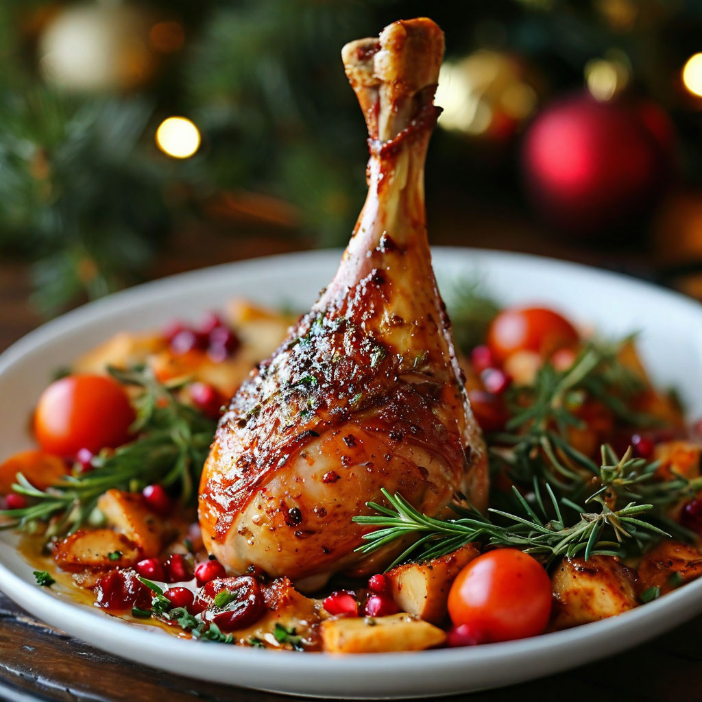 **Голень индейки к Рождеству по-американски** ✅Ингредиенты на 2 порции:** - Голень индейки - 1600 г - Горчица - 1 ст.л. - Мед - 1 ст.л. - Сухое шампанское - 200 мл - Соль - по вкусу - Сливочное масло - 50 г - Апельсин - 1 шт. - Пряности с прованскими травами - по вкусу - Микрозелень - для украшения - Соус из печеного перца с красным базиликом - для подачи ✅Пошаговый рецепт:** 1. **Подготовка индейки:** - Индейку помыть и обсушить бумажным полотенцем. 2. **Приготовление маринада:** - В емкость положить горчицу, мед, немного соли и шампанское. Шампанское хорошо размягчает мясо. - Добавить пряности. 3. **Маринование:** - Этой смесью обмазать индейку и дать немного пропитаться. 4. **Сочность:** - Под кожицу намазать сливочное масло для сочности. - Надеть кожицу на голени и еще раз натереть оставшимися специями. 5. **Запекание:** - Положить индейку в пакет для запекания, добавить дольки апельсина (птица любит цитрусовые). - Поставить в разогретую духовку при температуре 200