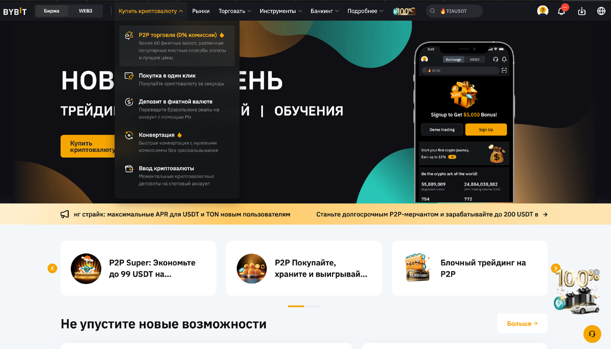 На главном экране нажимаем на раздел КУПИТЬ КРИПТОВАЛЮТУ и в выпадающем меню выбираем Р2Р ТОРГОВЛЯ