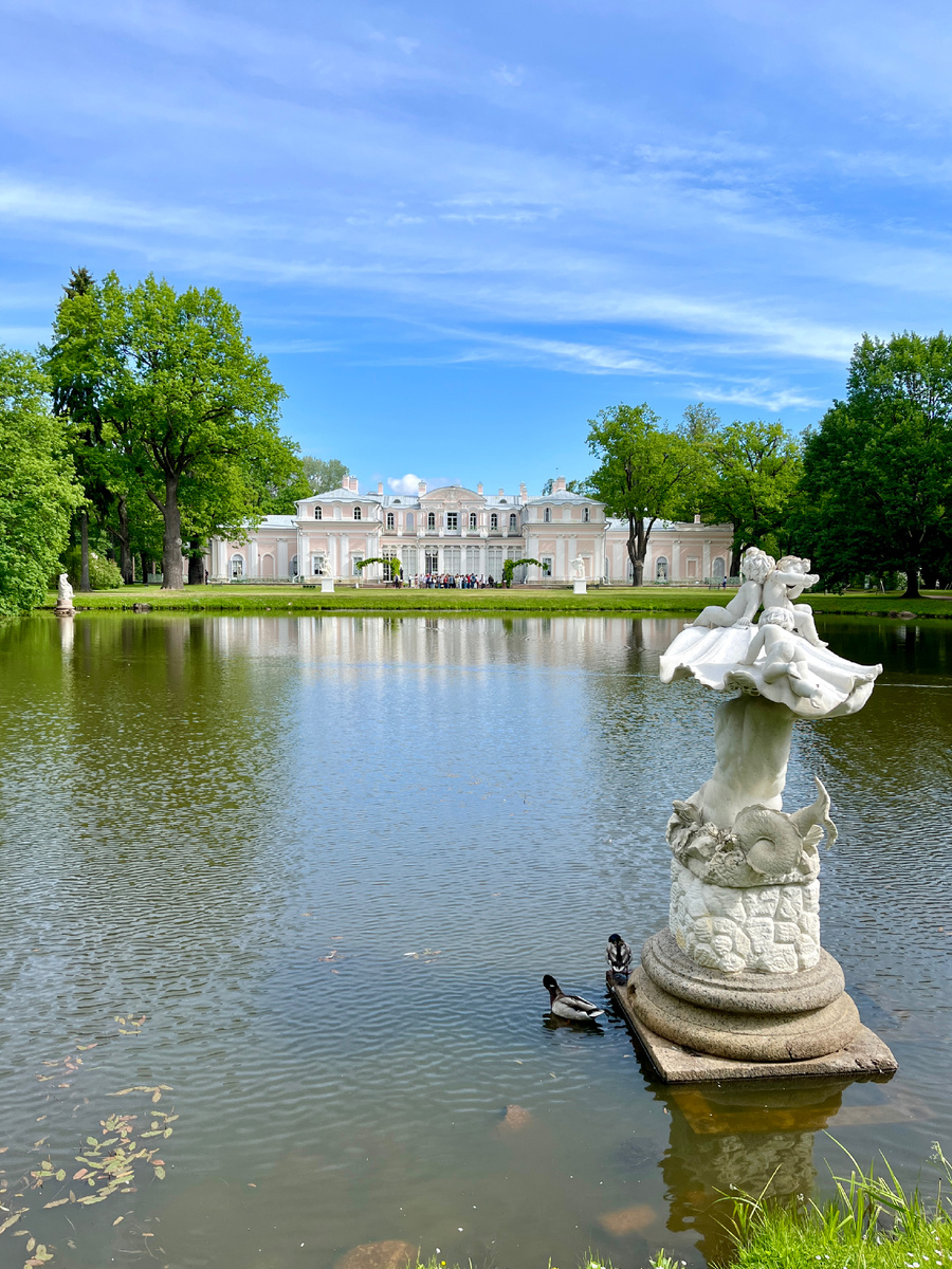Палац выполнен в стиле рококо (или пышного барокко) и отлично выглядит в композиции с декоративным прудом: