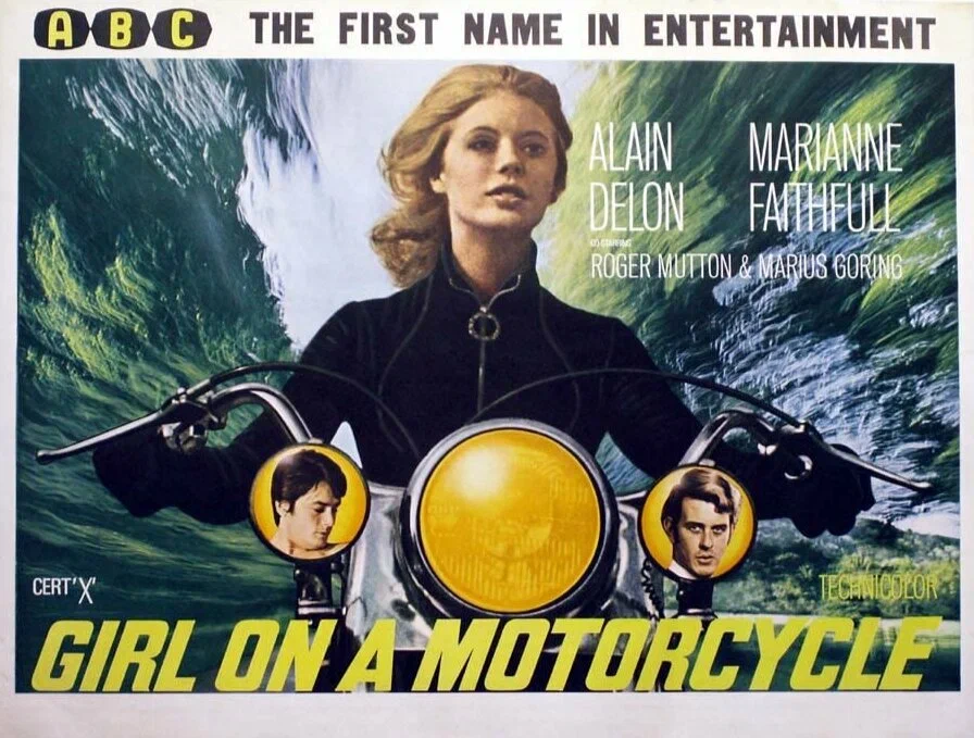 Оригинальное название фильма The Girl on a Motorcycle (1968). Аннотация к фильму: Очаровательная девушка по имени Ребекка одна едет через всю Европу на своем мотоцикле. Проезжая разные города и встречая новых людей, она вспоминает свою прошлую любовь и мечтает о будущей, т.к. едет к своему новому возлюбленному. Но не так все просто у нее на душе, да и длинная дорога полна неожиданностей. Очень чувственное кино. В первых же кадрах сам Ален Делон ударами хлыста срывает до нага одежду с наездницы, которая скачет по арене цирка на белой лошади. Это был сон. Девушка просыпается в чём мать родила, бежит натягивает чёрный кожаный экип, садится на мотоцикл и уезжает... Главная героиня - это молодая взбалмошная сильно озабоченная представительница золотой молодежи. Родители выдали её замуж за надёжного начитанного учителя. А она влюблена в мотогонщика с внешностью Делона. В общем она срывается от мужа и едет к своей "настоящей любви". Героиня сама думает только обо дном, и ей кажется, что все