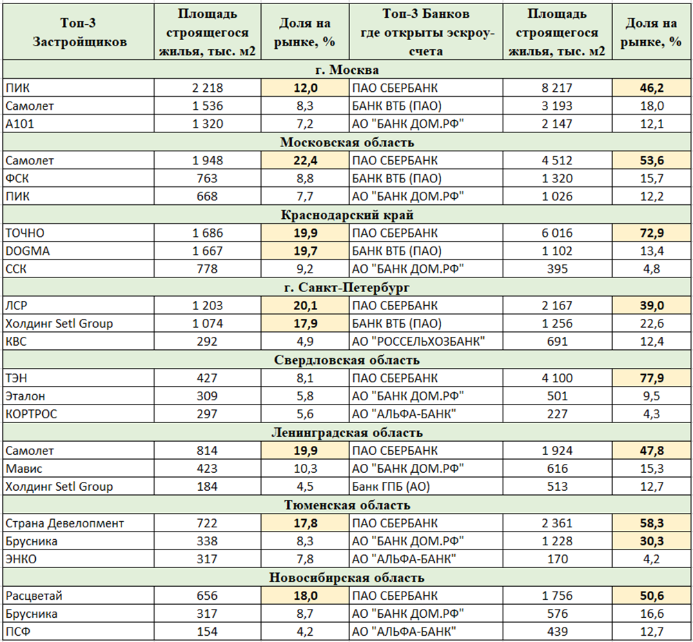 Топ ключевых игроков рынка жилищного строительства, и их доли на рынке в ноябре 2024 г: Информация подготовлена по данным сервиса DomAnalyticsBot. Крупнейшие застройщики имеют сравнительно небольшую долю рынка – в рассматриваемых регионах не более 23%, при этом в каждом регионе свои ведущие компании. В то же время госбанки фактически являются монополистами, а абсолютный лидер - Сбербанк, с долей 55%. Больше полезных материалов в телеграм-канале DomAnalyticsInfo