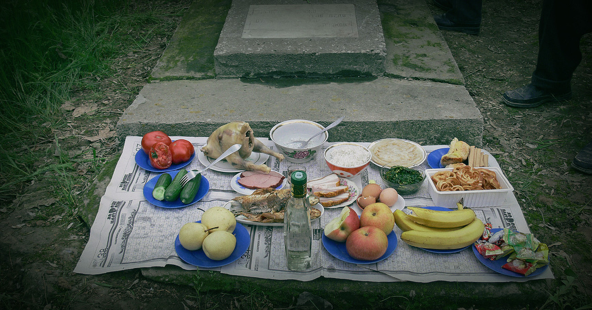 Это же вы кушаете, а не он. Вы просто лишний повод находите, чтобы покушать, выпить, посидеть на природе, и при этом льстите себе, что вы каким-то образом общаетесь с усопшим, ему помогаете.